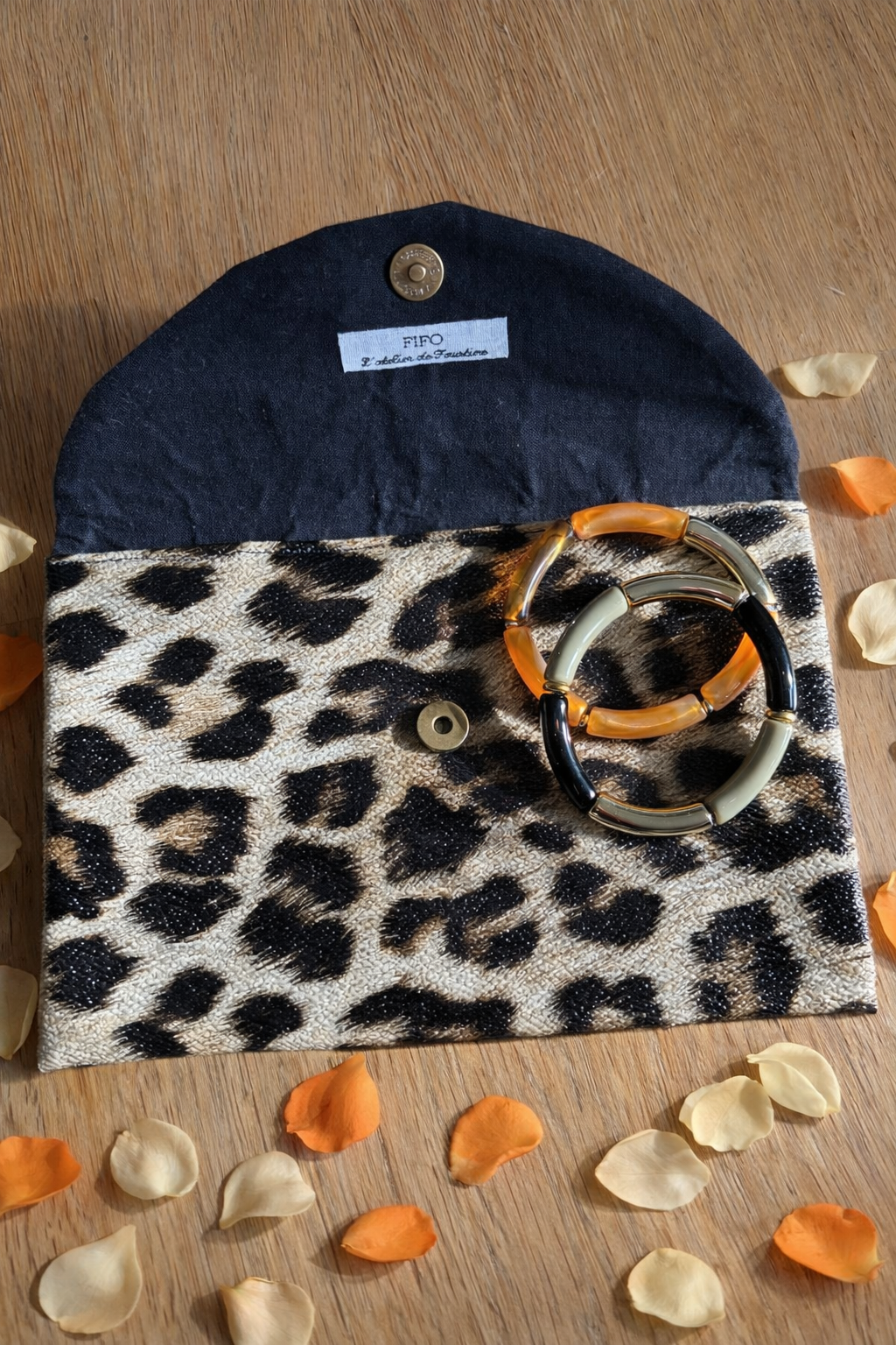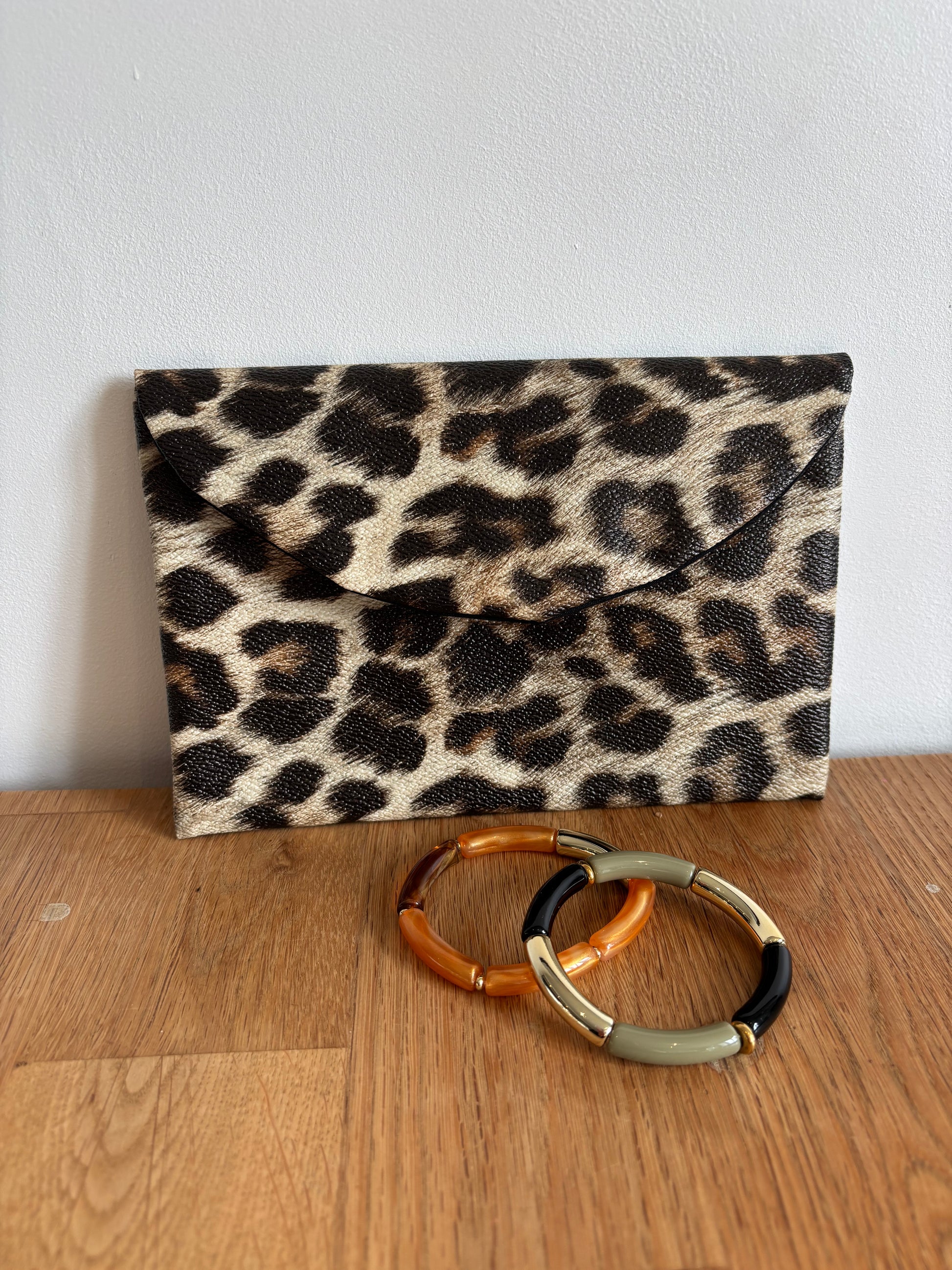 Cette box comprend une pochette enveloppe (18 x 15 cm), idéale pour maquillage et accessoires, accompagnée d'un bracelet assorti pour une touche élégante au quotidien.