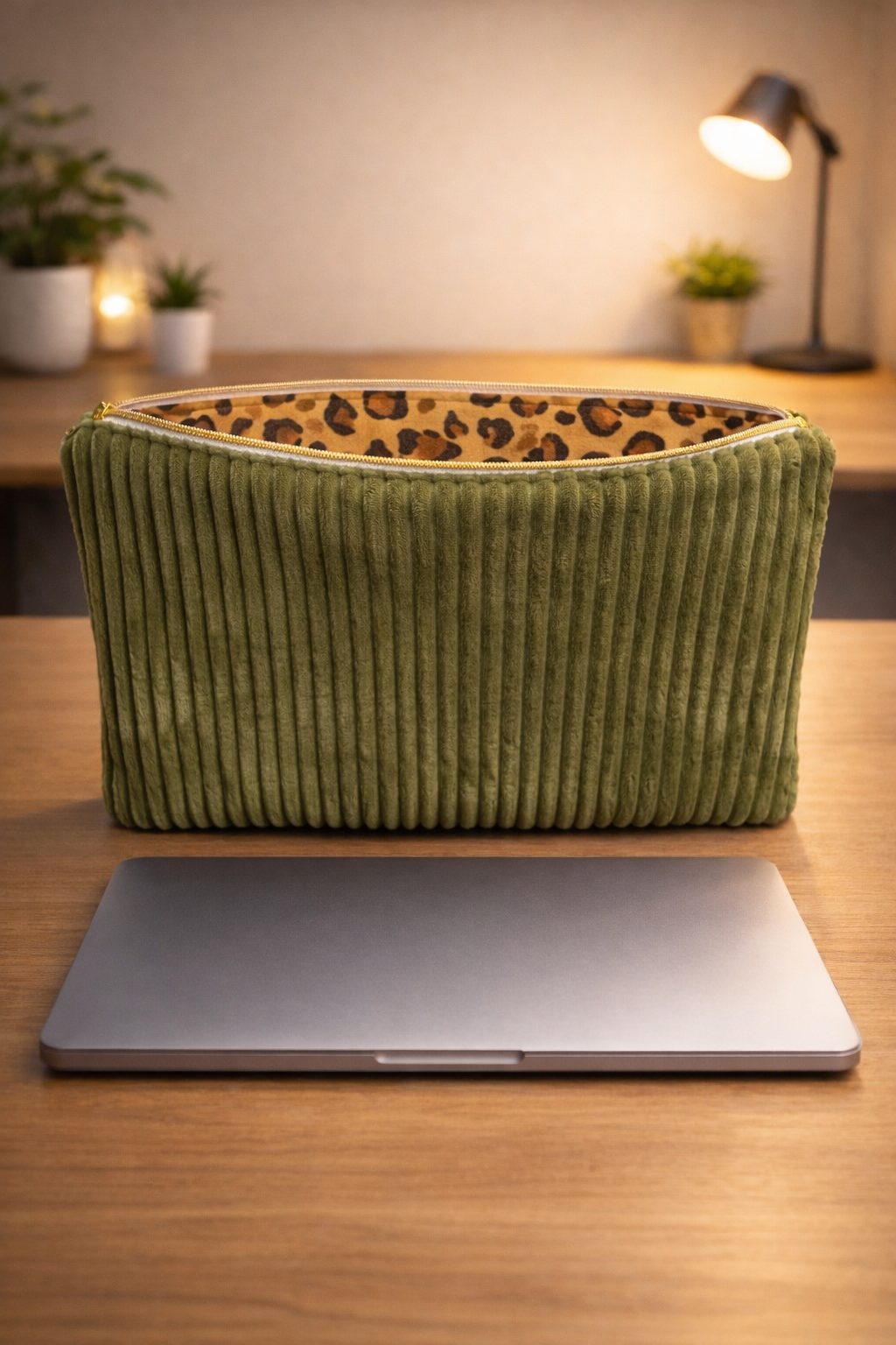 Pochette d’ordinateur adaptée aux 13/14 pouces, confectionnée en velours côtelé vert.
