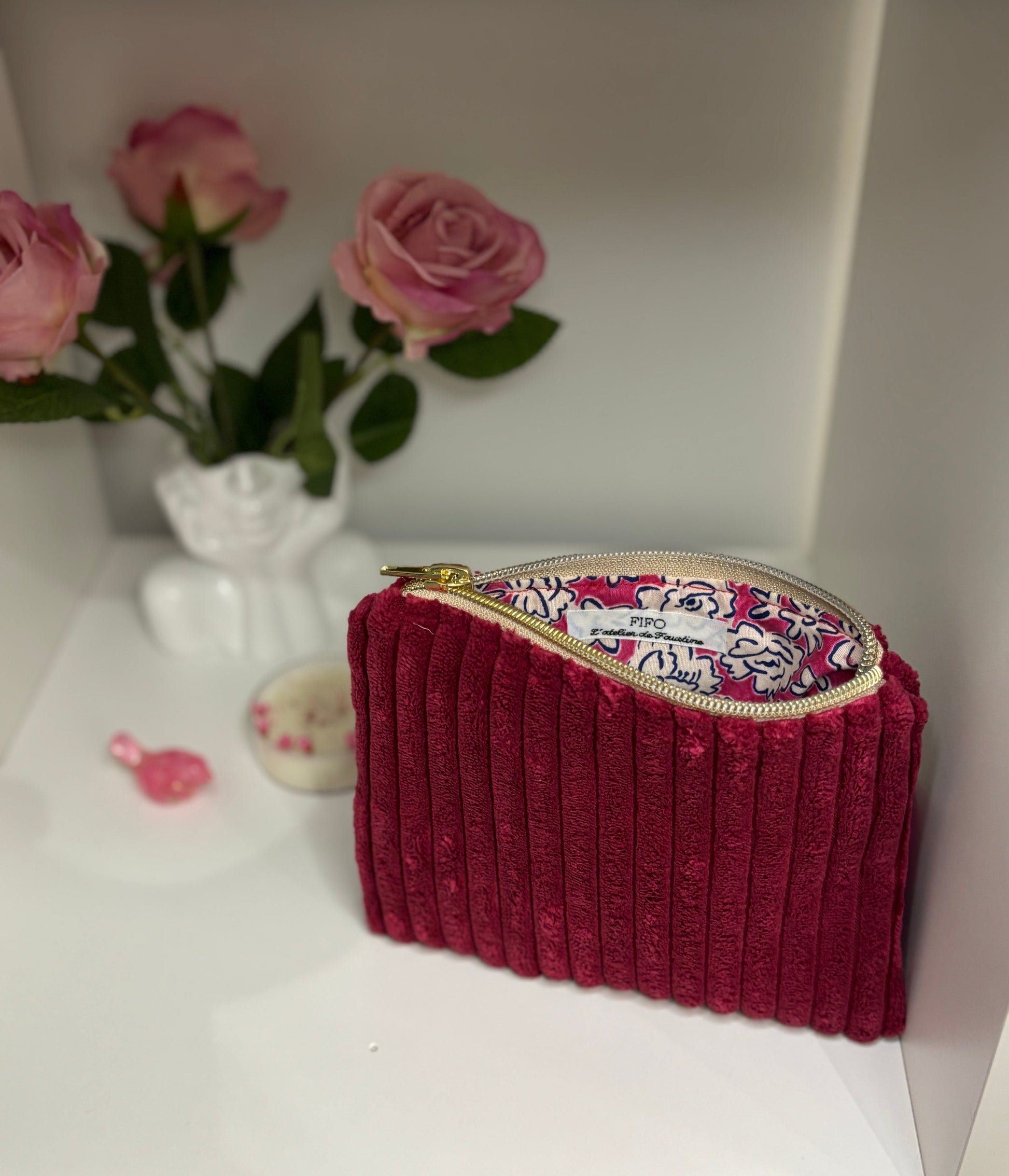 Pochette zippée confectionnée en velours côtelé fuchsia à l’extérieur et doublée d’un coton fleuri.
