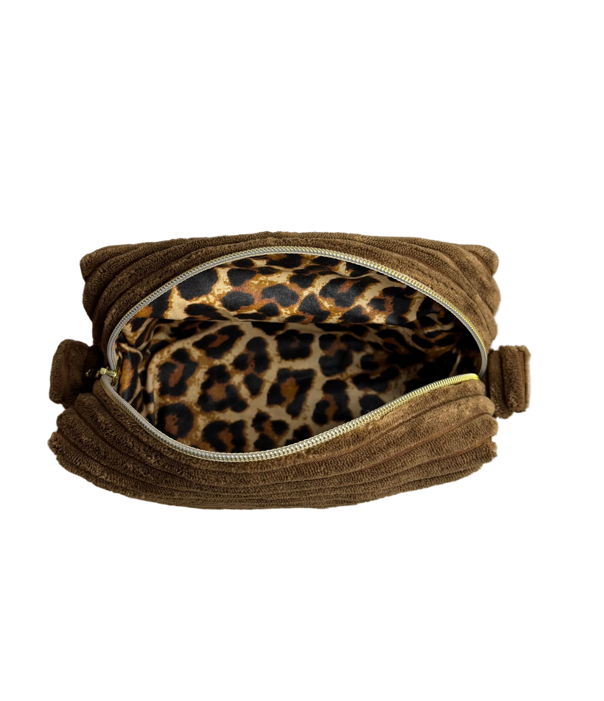 Cette trousse de toilette est confectionnée en velours marron à l'extérieur et dotée d'un intérieur imperméable, idéal pour garder vos produits de toilette en sécurité.