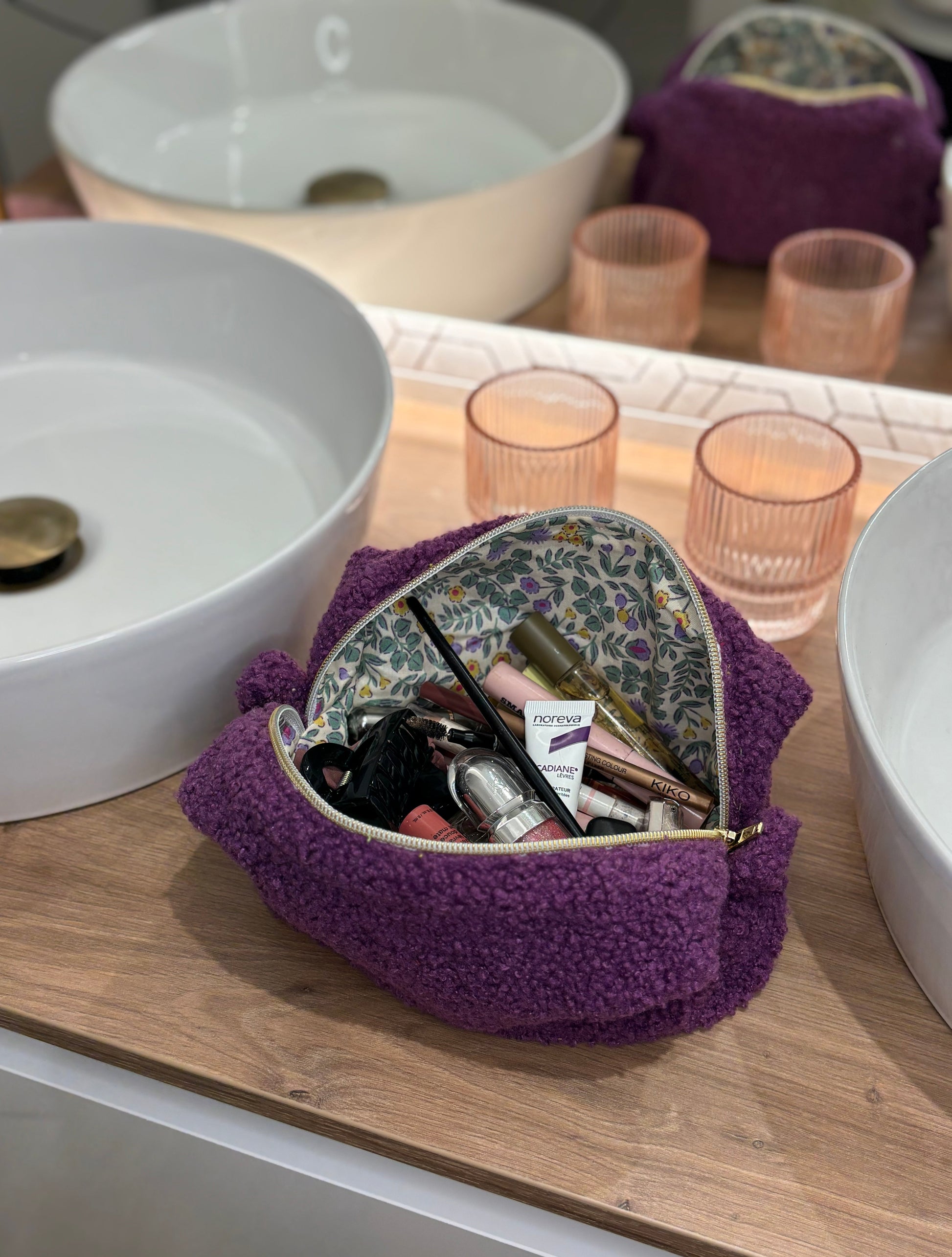 Cette trousse de toilette est confectionnée en moumoute violette à l'extérieur et dotée d'un intérieur imperméable, idéal pour garder vos produits de toilette en sécurité.